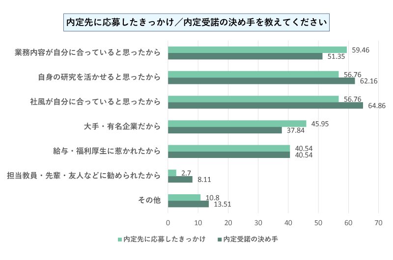 その他、「担当教員等からの推奨」も変化率が大きかったです。内定先決断の最後の一押しとして、周りの意見を参考にする人も一定数いるようですが、9割以上の方が、自分の意志で最終的に判断していたようです。