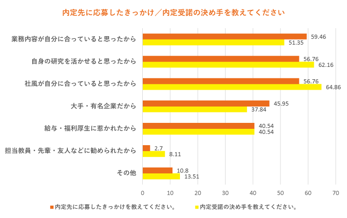応募のきっかけとしては「業務内容」が最も多く、続いて「自分の研究を活かせるかどうか」「社風」が同数で回答が多くなりました。
