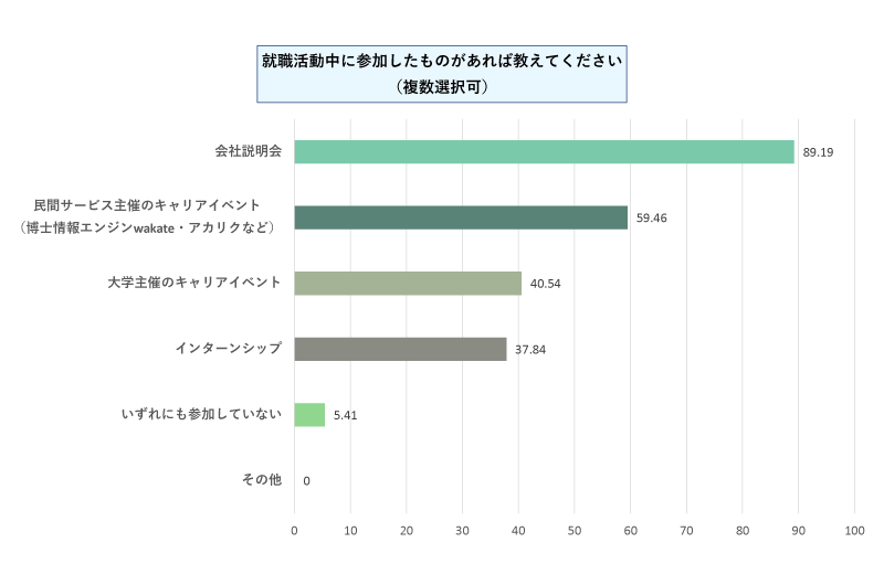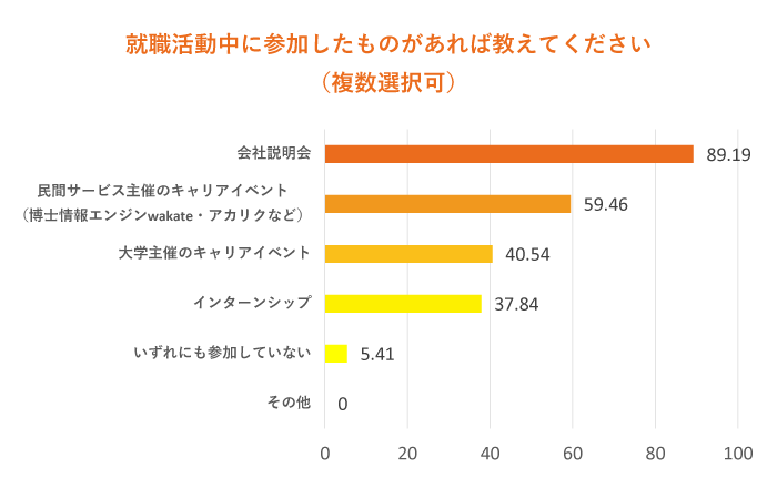大学主催のキャリアイベントは41%、民間サービス主催のキャリアイベント(博士情報エンジンwakate・アカリクなど)は59%、インターンシップへの参加者は38%となりました。