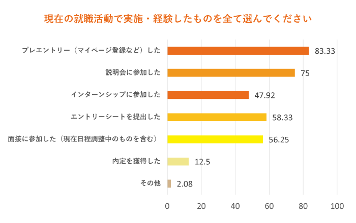 一方で、エントリーシートを提出していない人も42%見受けられました。「ESを出す段階まで行ってない人」がほとんどでしたが、内訳を詳しくみると、「ESは出していないけど内定を獲得した人」も少数ながらいました。また、プレエントリー(マイページ登録など)をせずに就活している人の存在も確認できました。