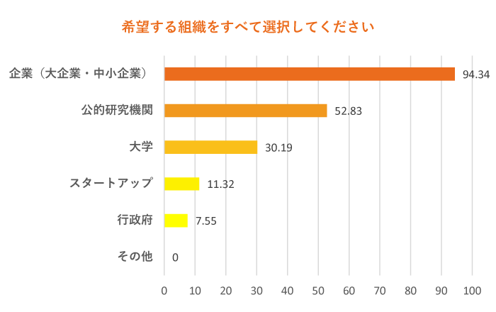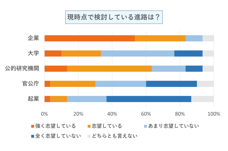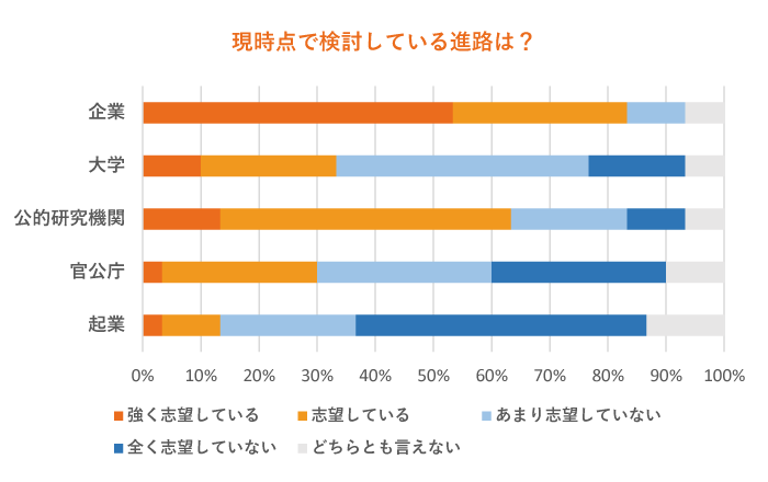 やはり「企業」への志望度が高く、続いて、公的研究機関、大学となっています。